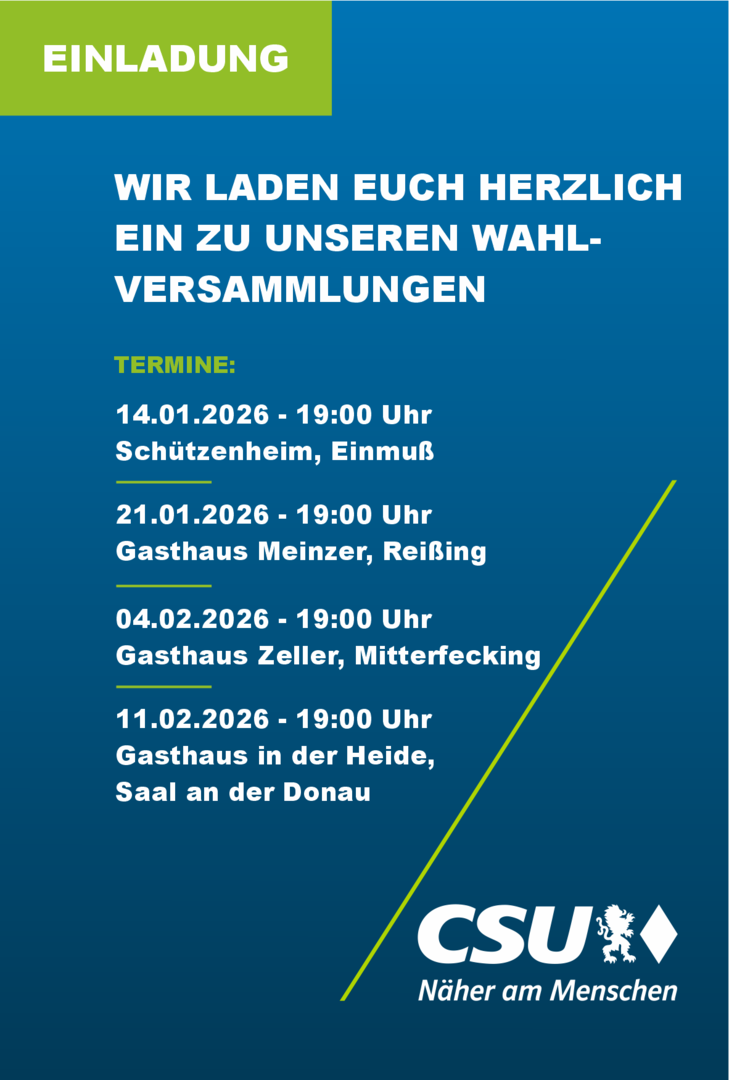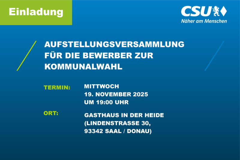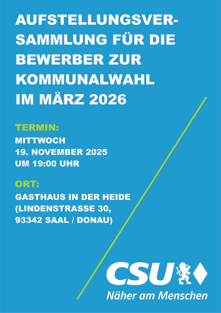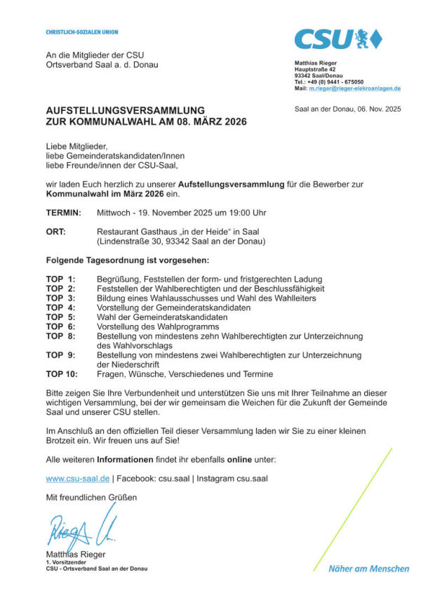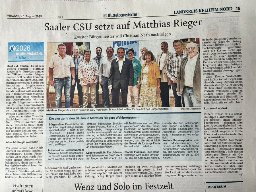 Die CSU Saal hat in ihrer jüngsten Mitgliederversammlung ein starkes Signal für die Zukunft gesetzt: Mit großer Zustimmung wurde Matthias Rieger offiziell zum Bürgermeisterkandidaten für die Kommunalwahl 2026 nominiert.